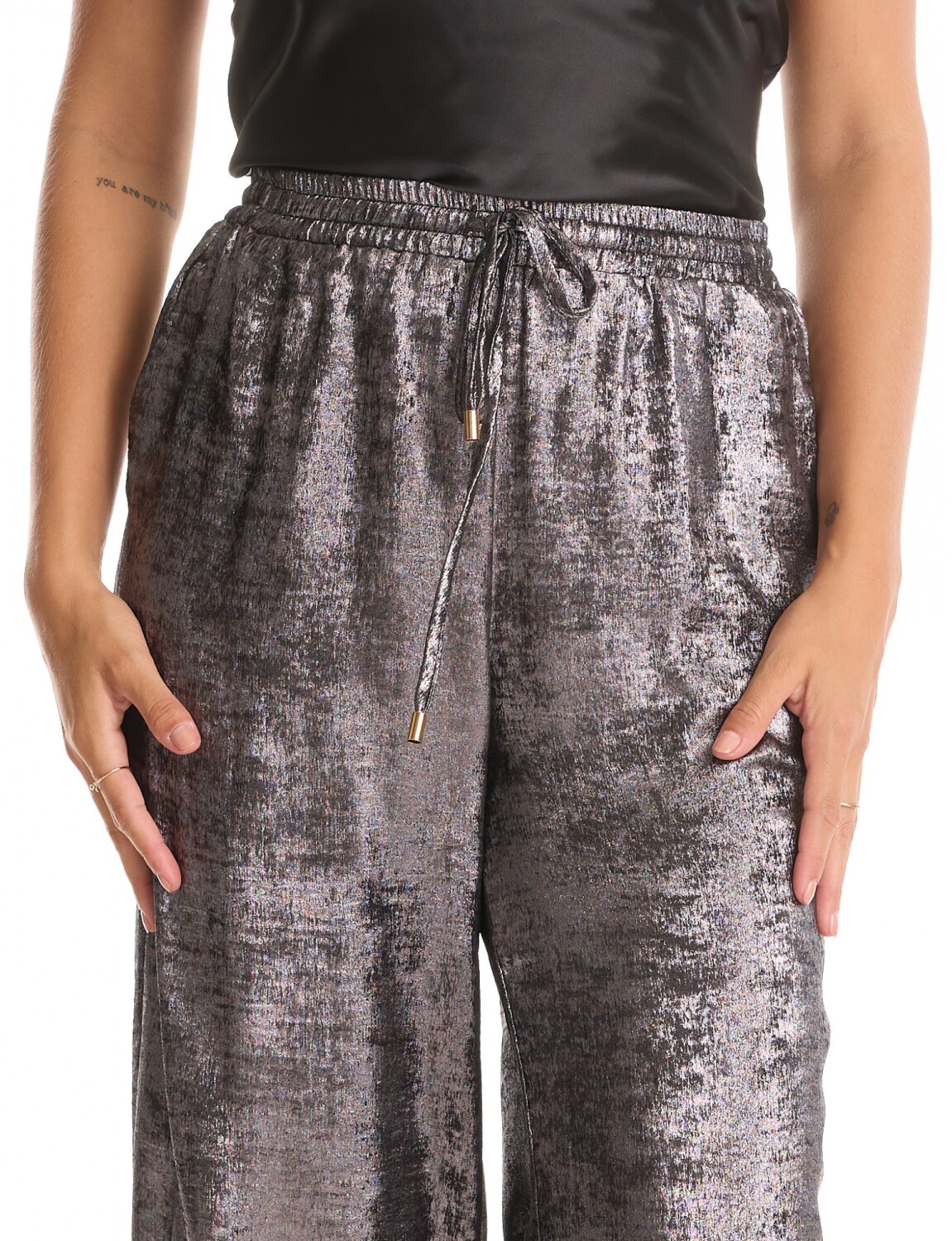 Pantalón en laminado metalizado, marca Allie Rose.
