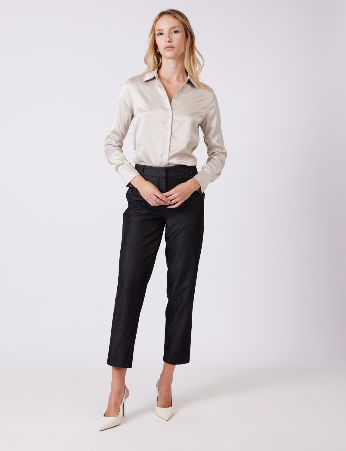 Este pantalón de corte cigarette destaca por su tejido de apariencia denim con un acabado satinado premium.