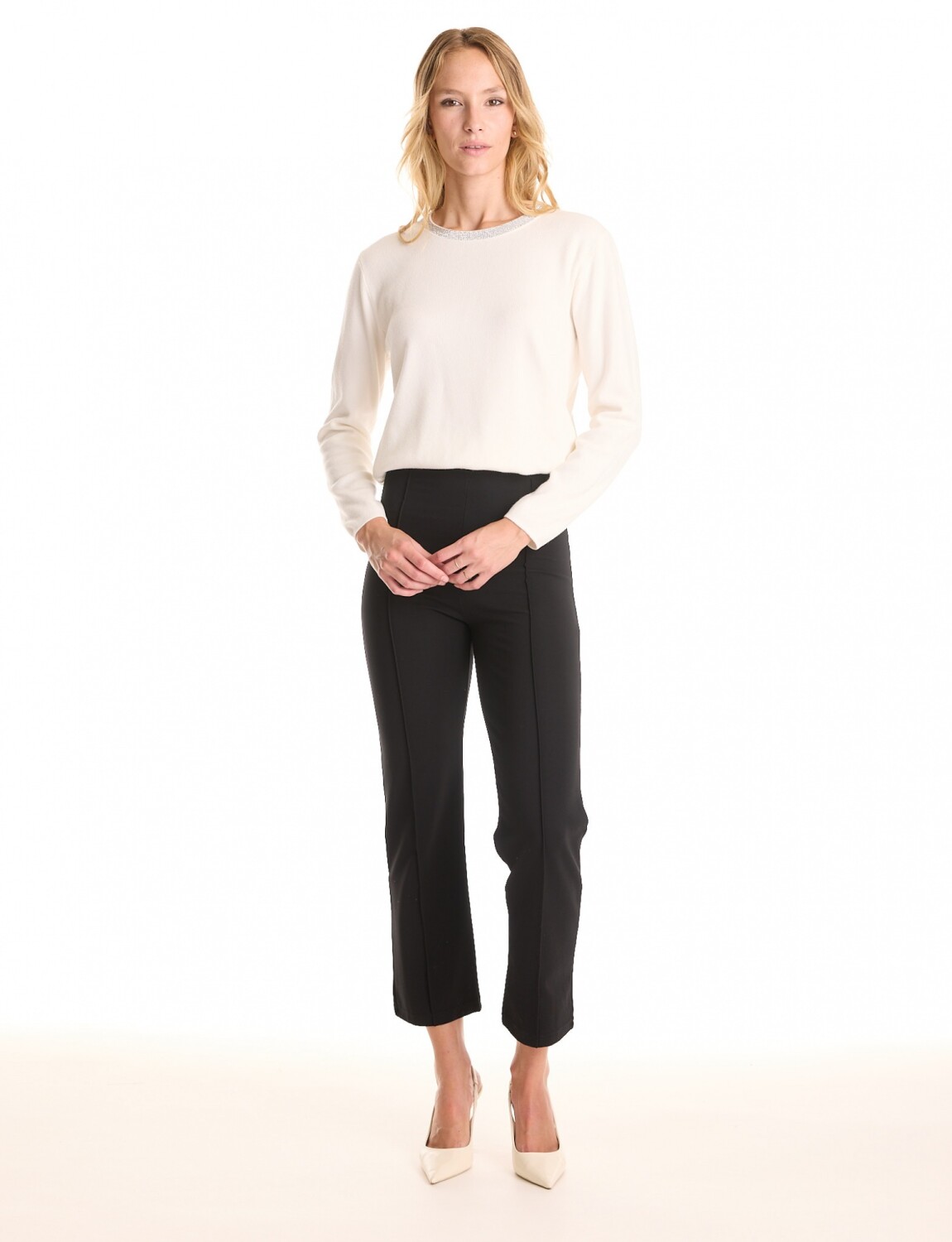 Costura vertical pronunciada a lo largo de cada pierna, alargando visualmente la silueta y mantiene la estructura de la prenda.