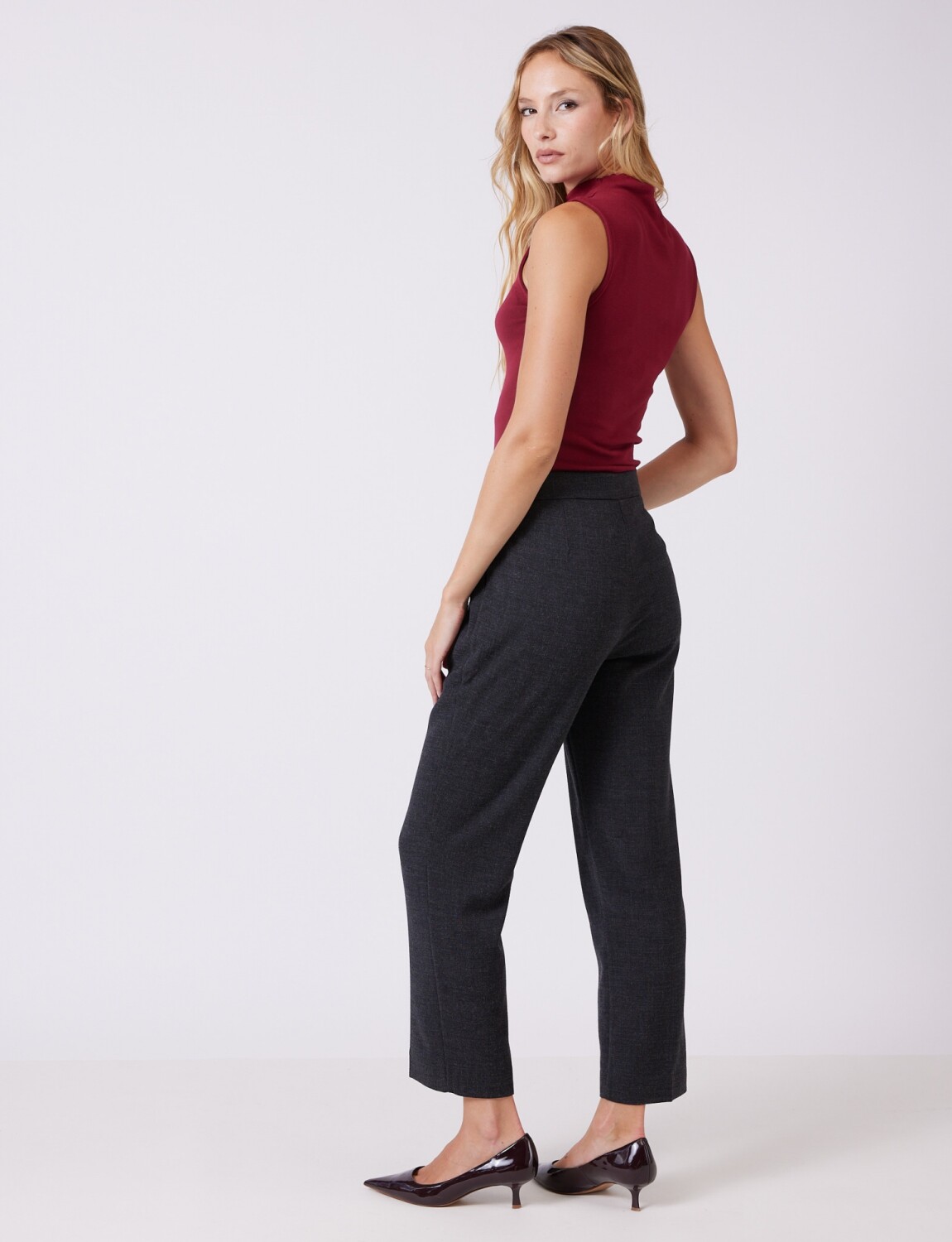Tiro Medio-Alto: Cintura estructurada con presillas para cinturón que asegura un ajuste cómodo y definido.