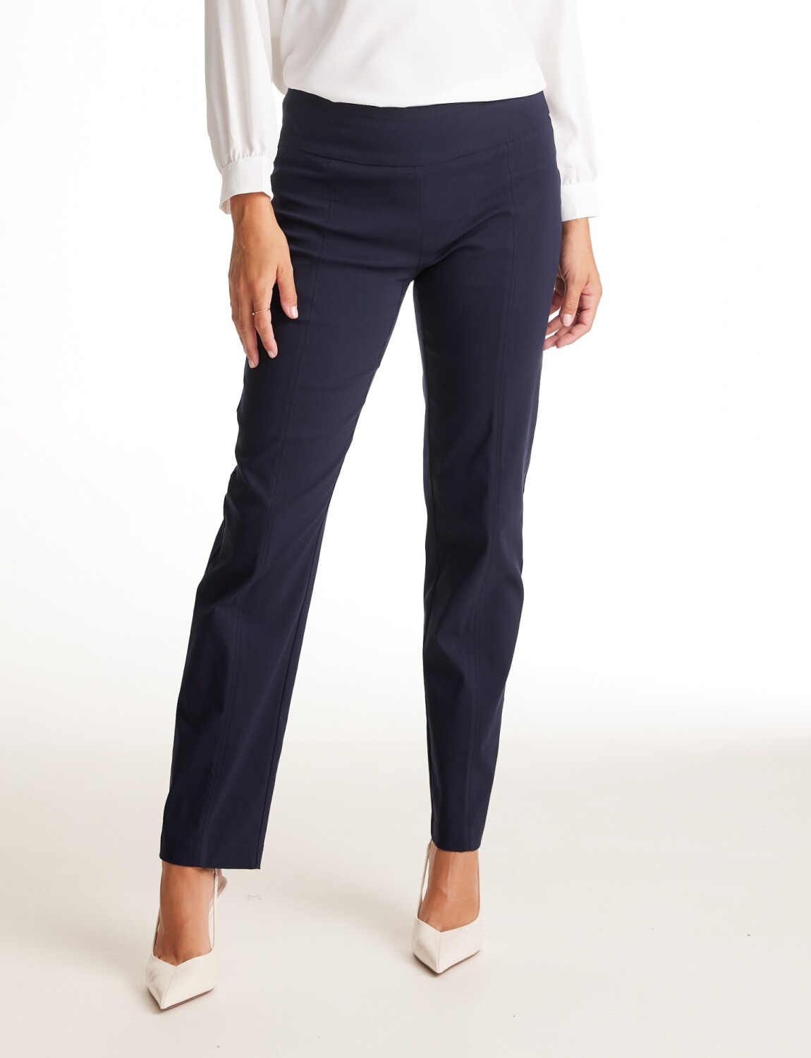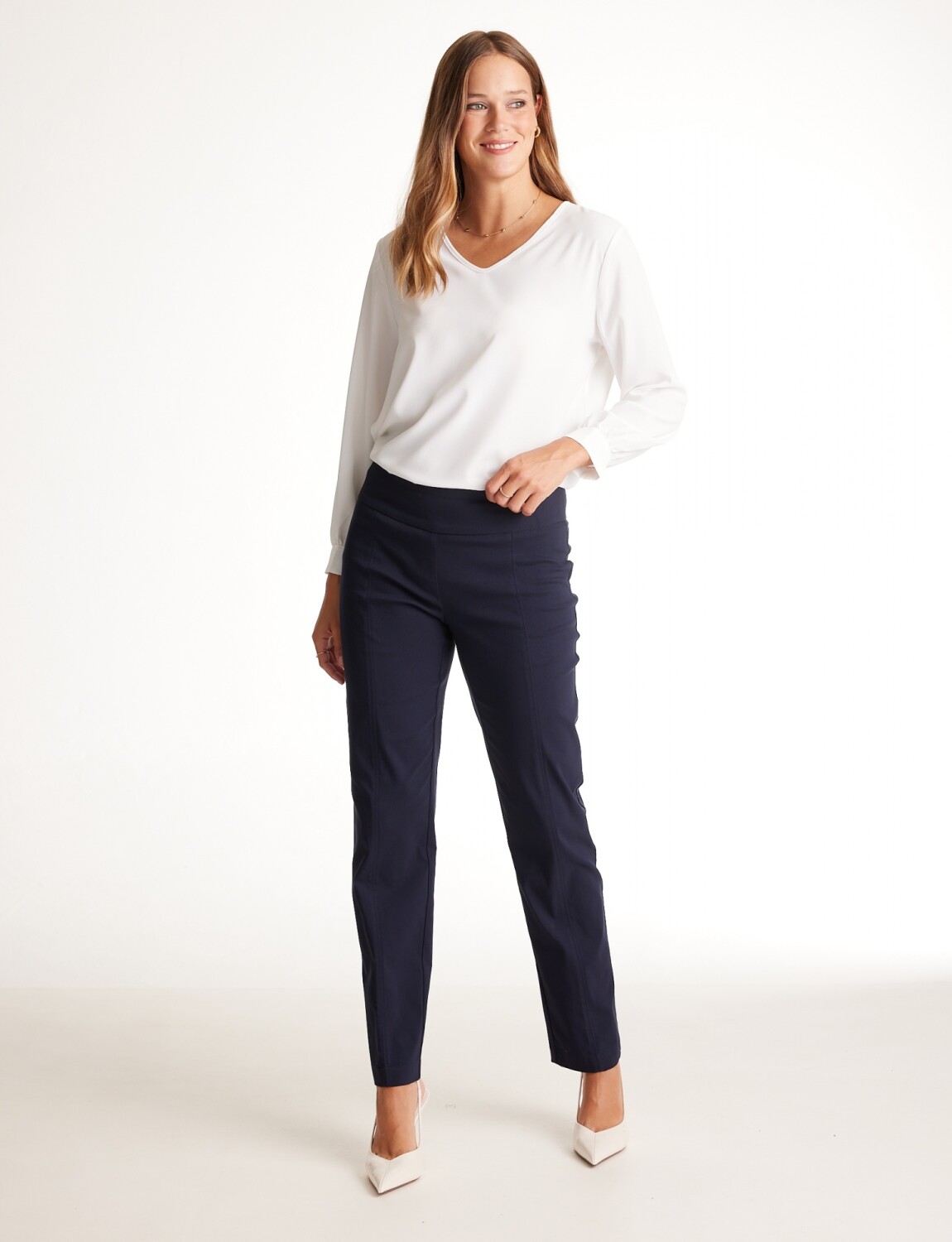 Frente limpio y bolsillos posteriores simulados para evitar volumen innecesario en la cadera. Composición: 76% Rayón, 21% Poliamida, 3% Elastano.