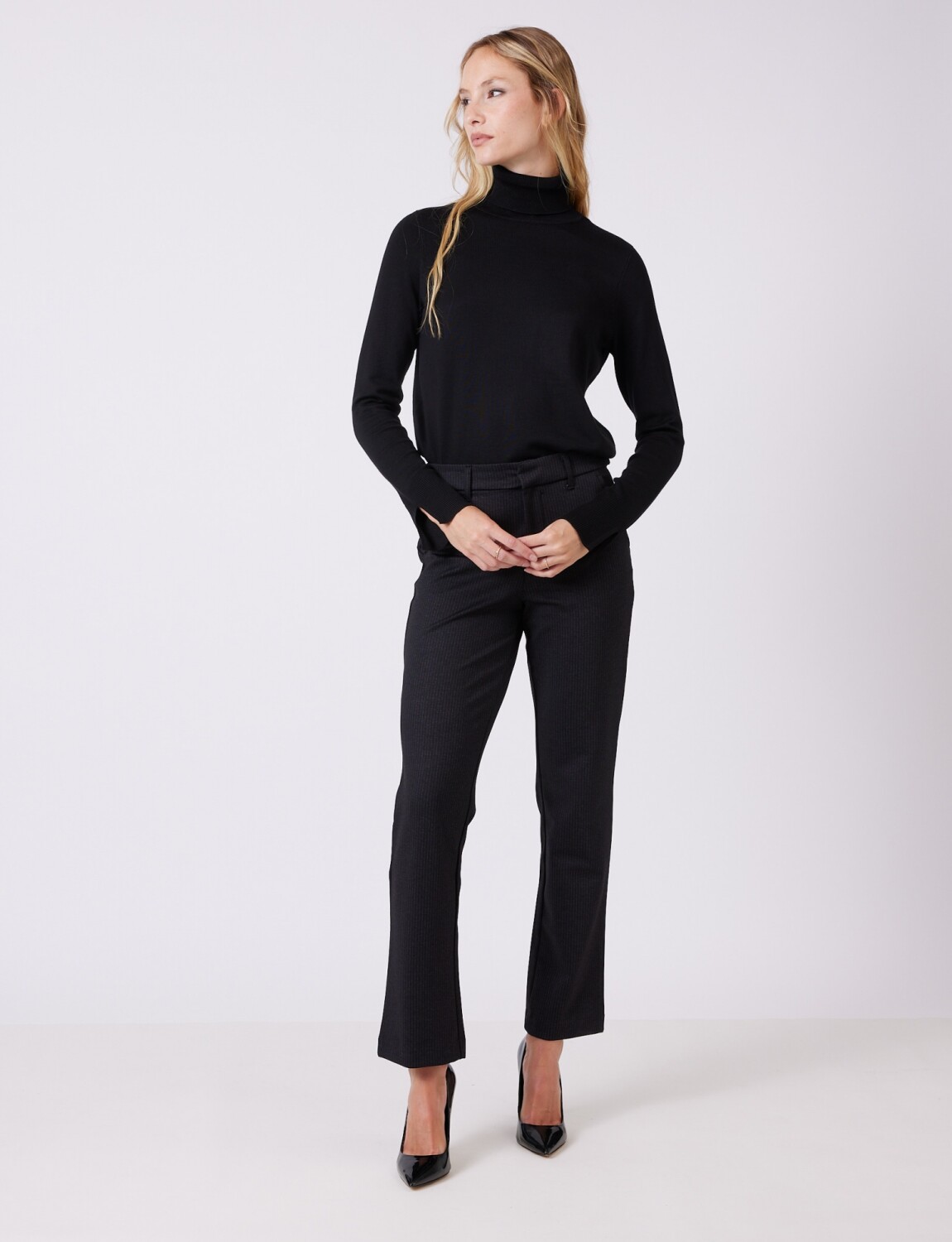 Pantalón confeccionado en tejido de punto estructurado que combina formalidad con un toque de elasticidad para máxima comodidad, asegurando que la prenda mantenga su forma original.