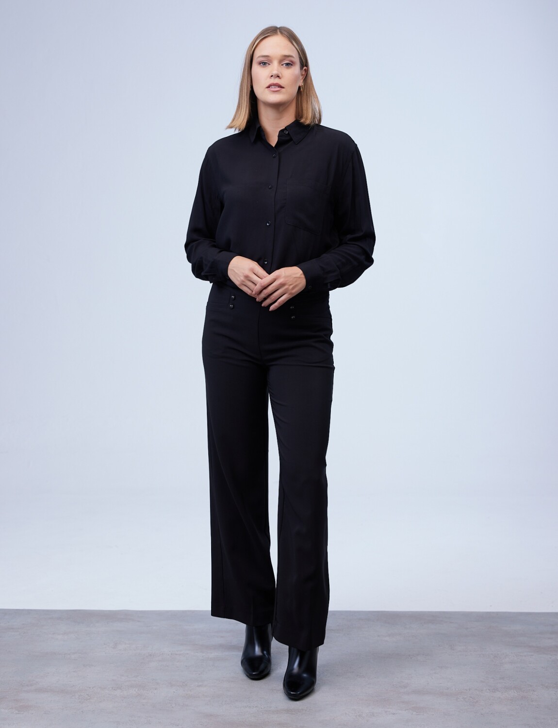 Pretina ancha con aplique de botones y bolsillos simulados con tachas.