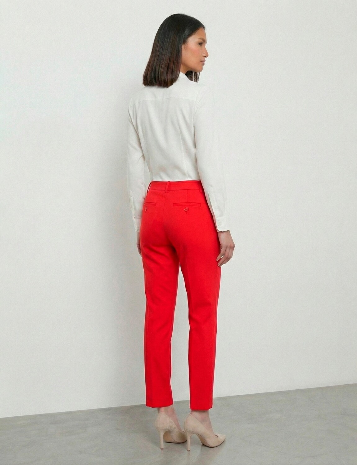 Presenta una nervadura vertical marcada que ayuda a alargar visualmente las piernas y refuerza el carácter sastrero de la prenda.