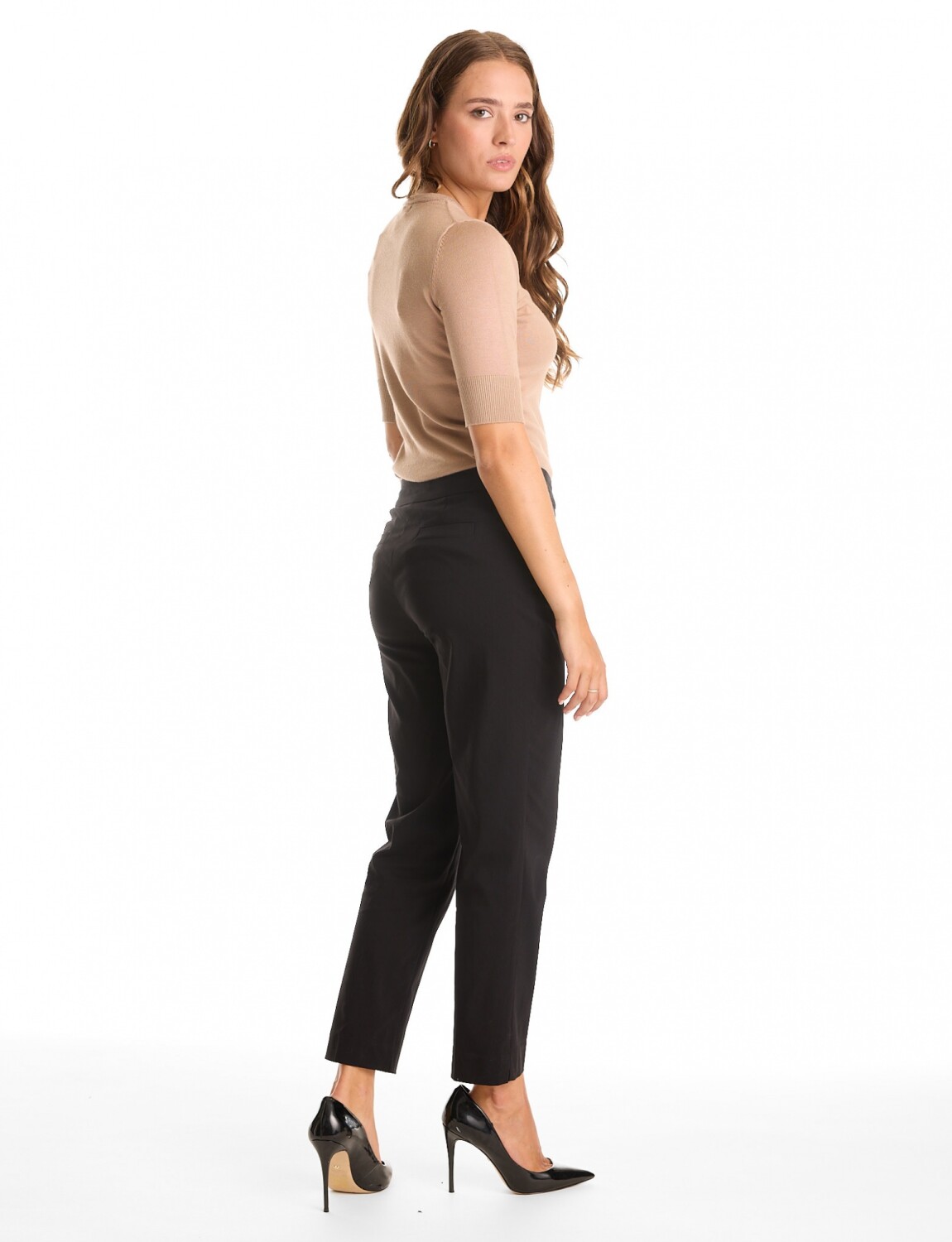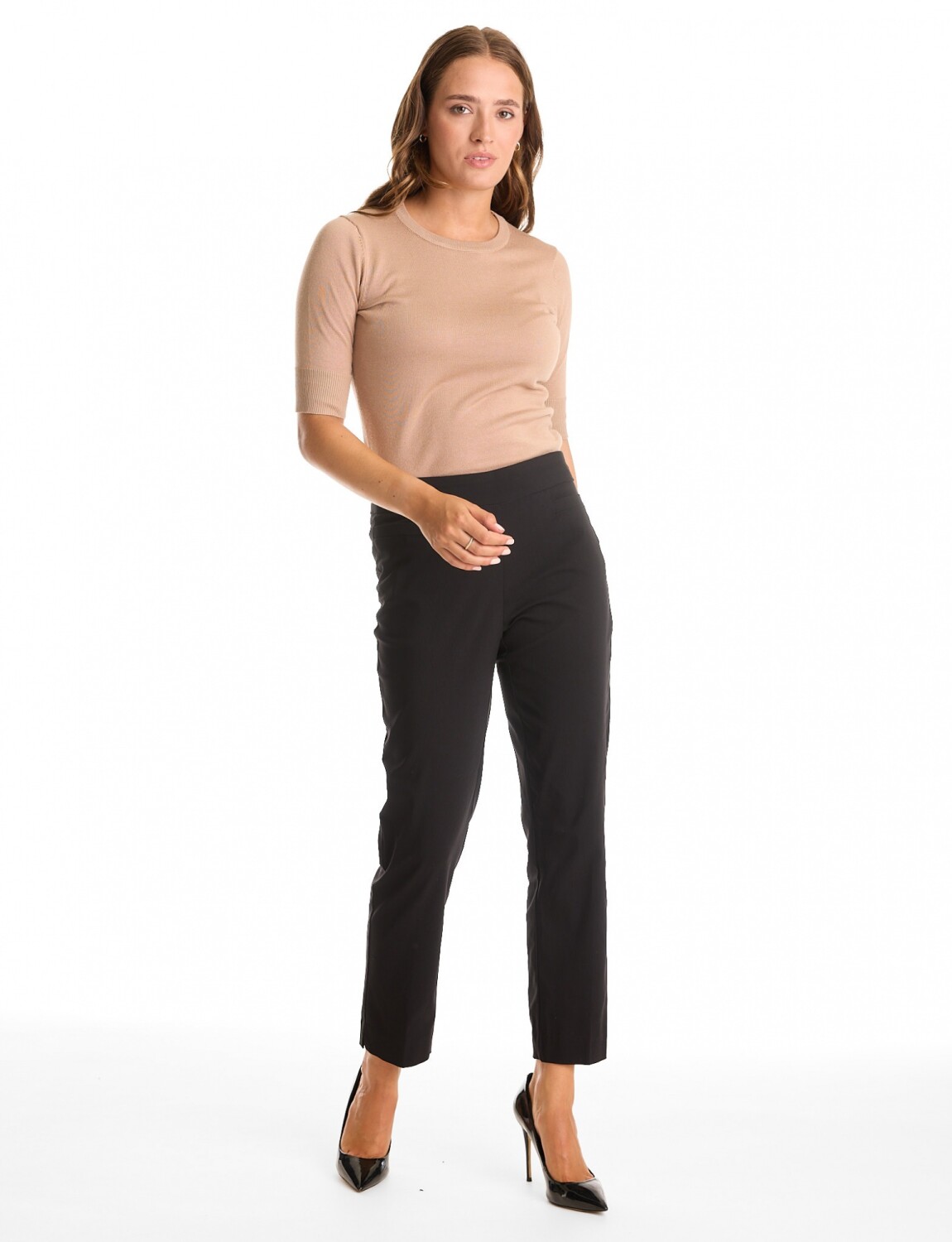 Tiro medio con cintura ancha estilo pull-on, garantiza una línea visual limpia y minimalista, libre de cierres o botones.