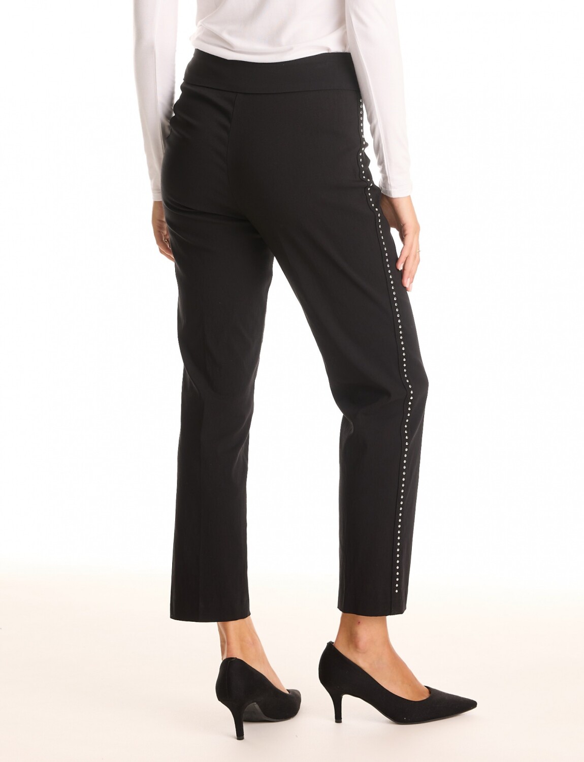 Destaca por una hilera vertical de micro-tachas metálicas que recorre todo el lateral de la pierna.