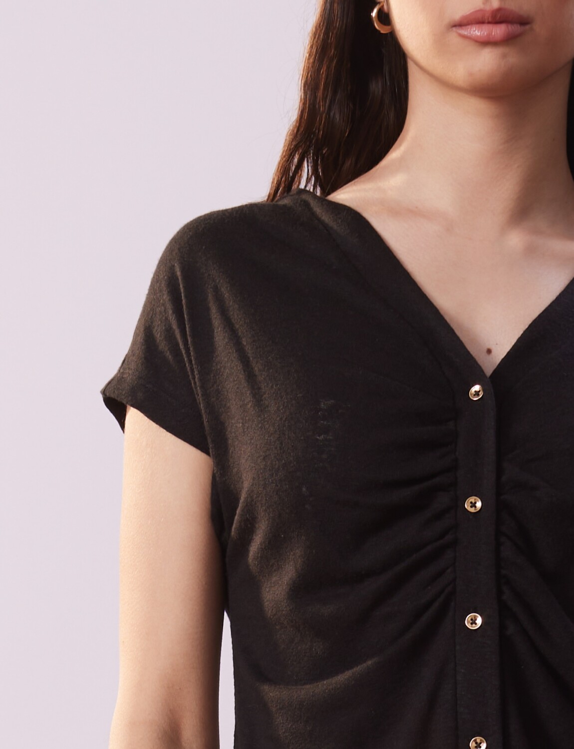 Escote en V con abertura y botones.