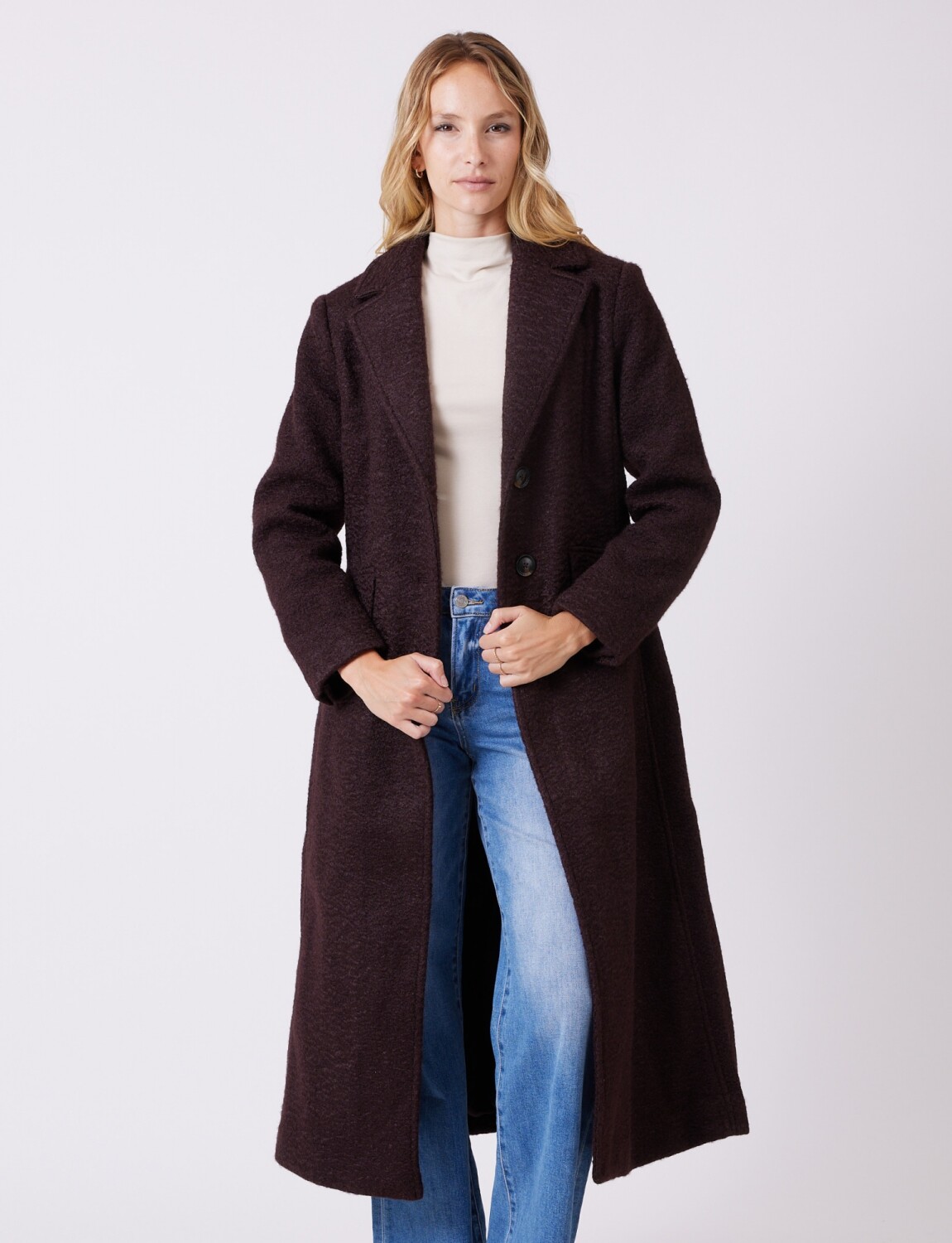 Cuello de solapa amplia que aporta estructura y elegancia.
