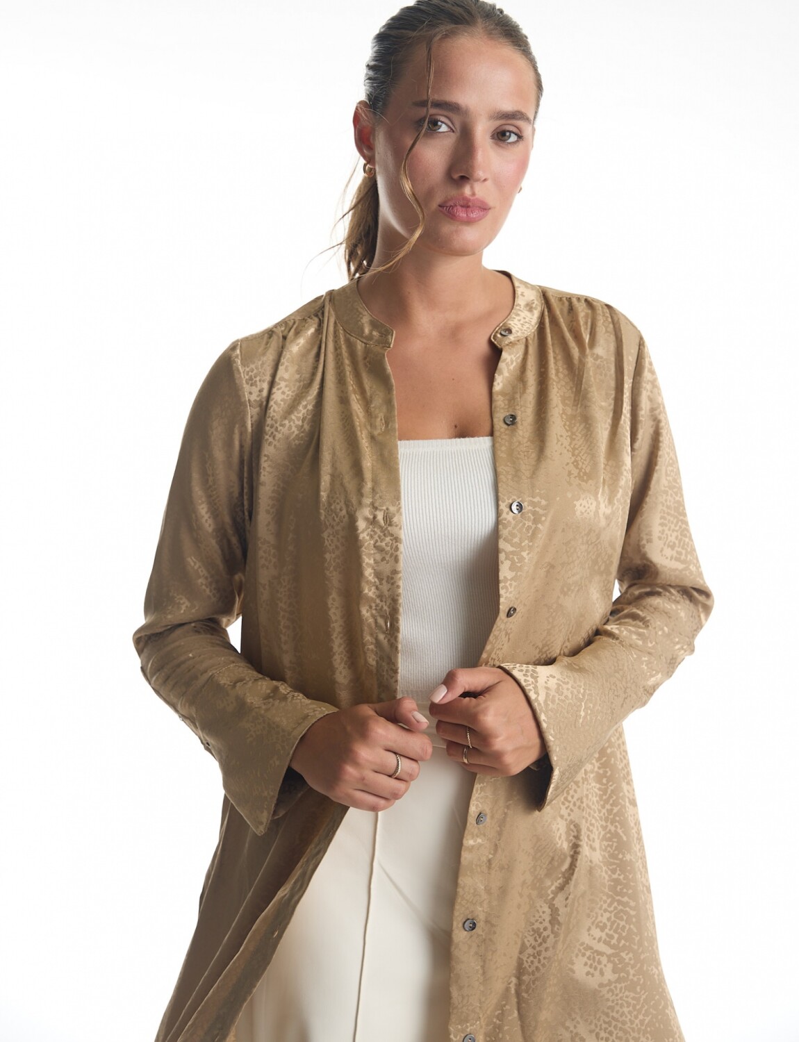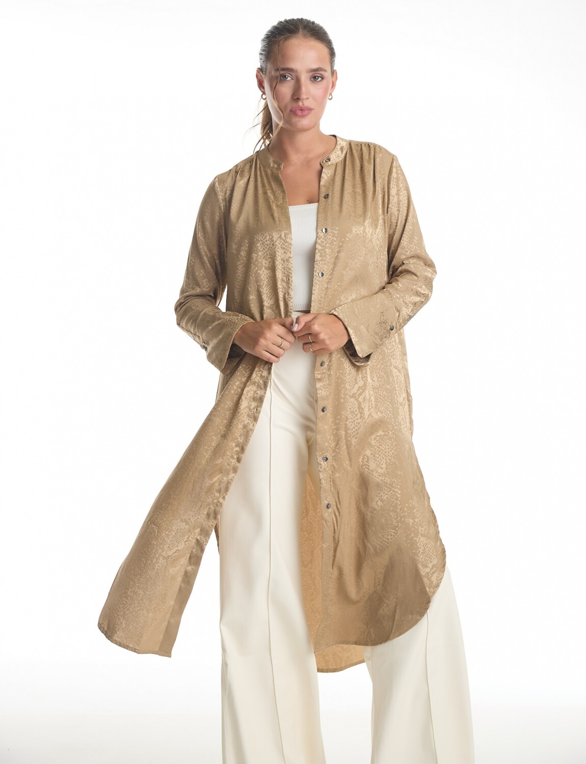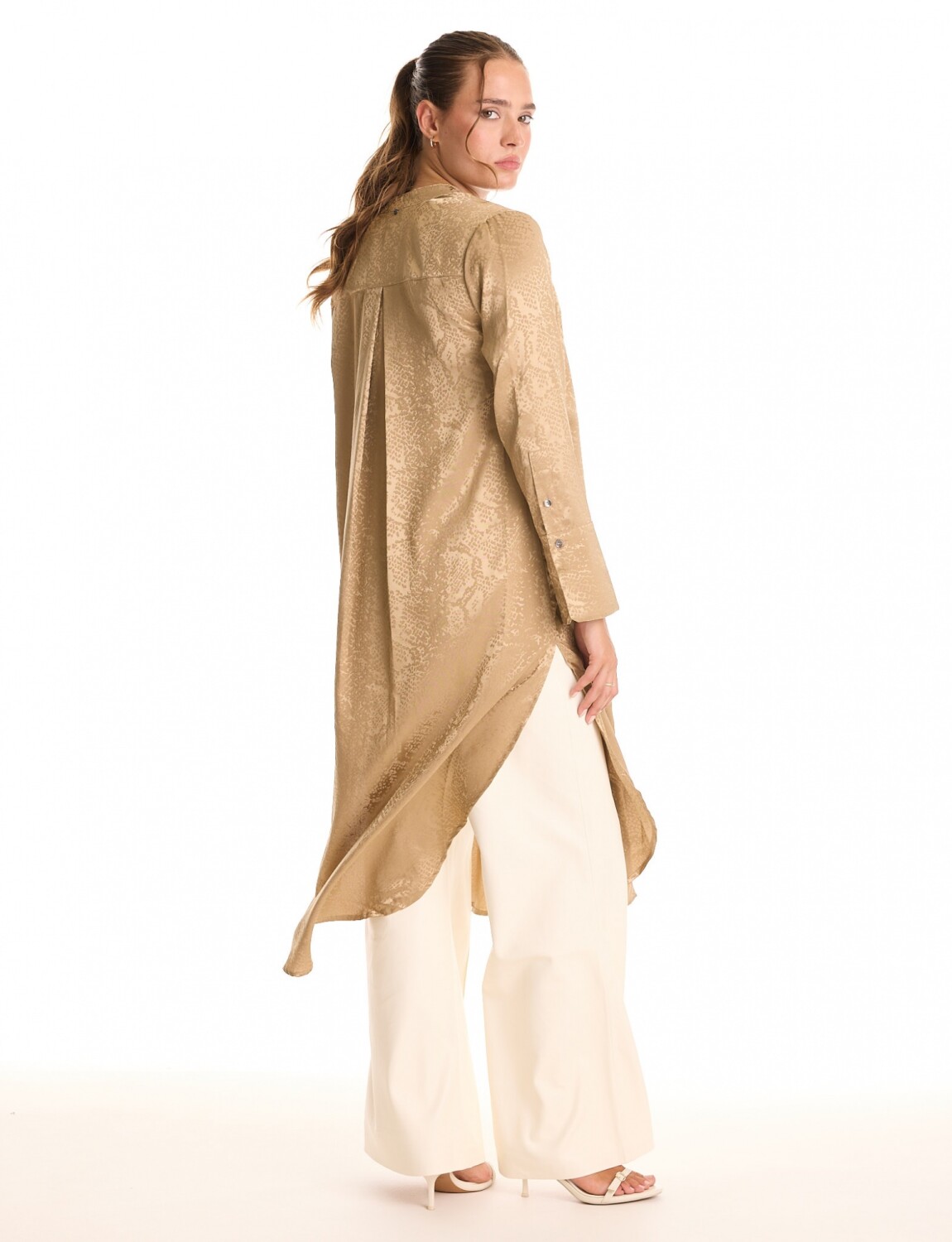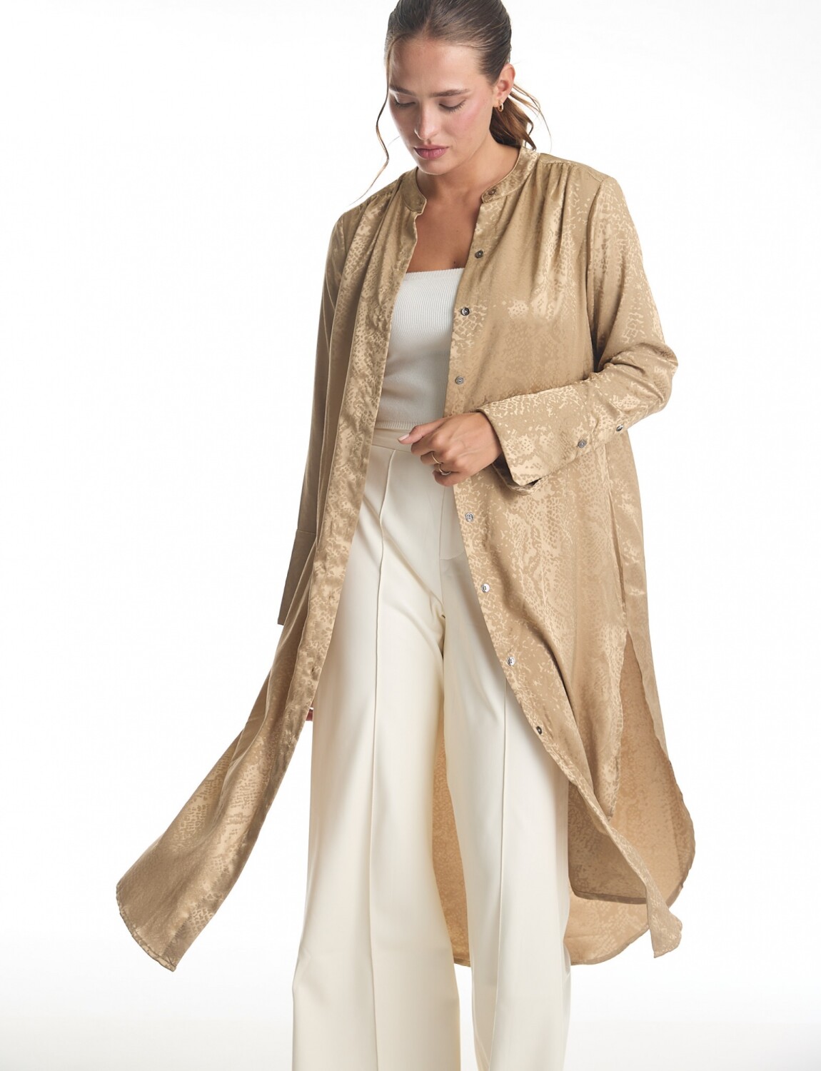 Túnica satinada de silueta oversize y fluida de largo maxi, marca Adrienne Landau.