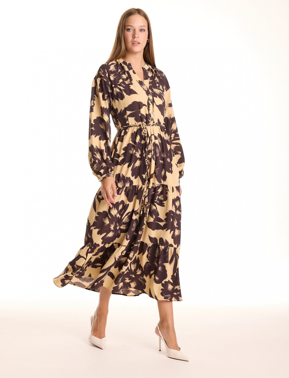 Vestido Maxi Cinto Flores - Beige/multi