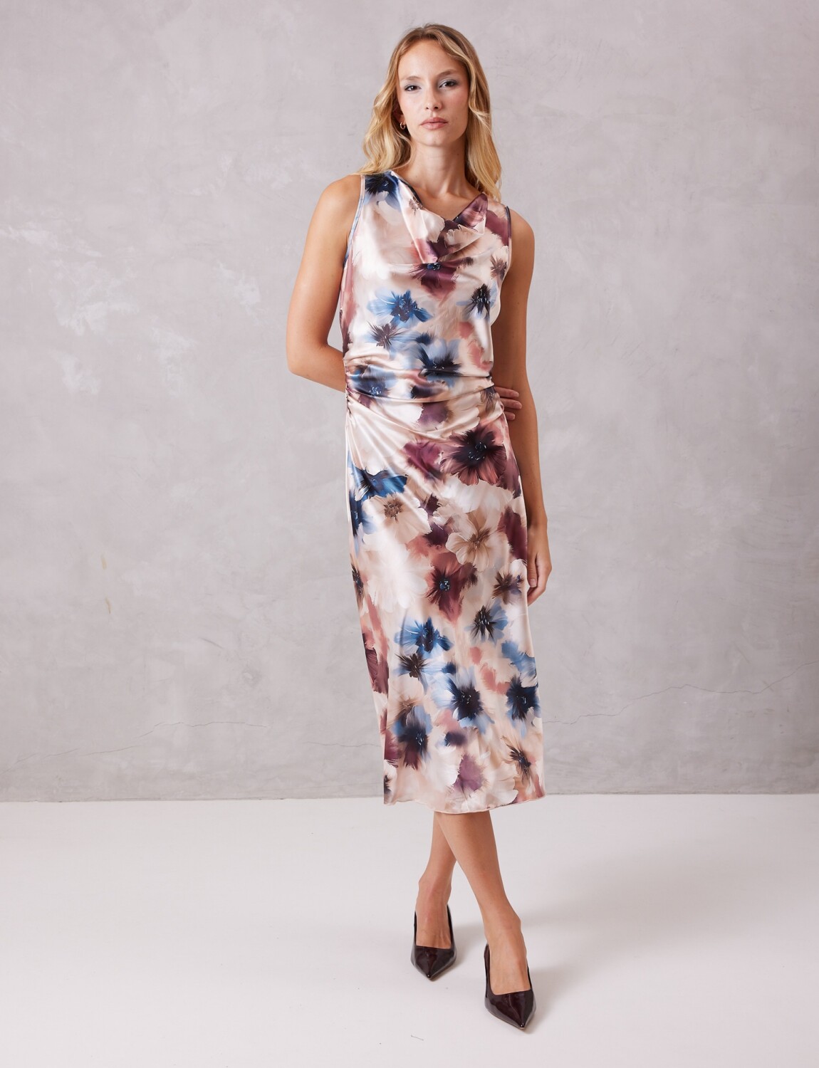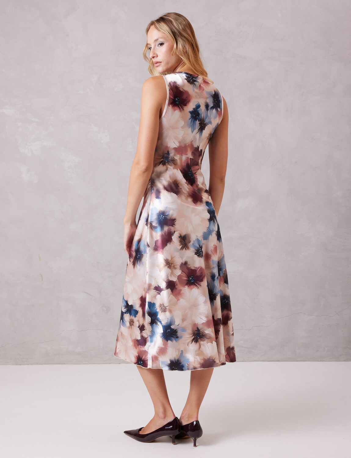 Este vestido midi destaca por su impecable confección en un satén fluido de brillo sedoso, que resalta un exquisito estampado floral.